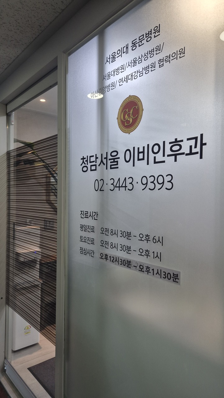 위치청담서울이비인후과Tel : 02-3443-9393서울특별시 강남구 학동로 433, 9층 (청담역 8번출구)선교사 진료상담 : 02-3443-9393진료과목- 일반1. 이학적검사 - 귀, 코, 목 내시경비디오 검사기2. 단순방사선 촬영 - 방사선촬영기3.각종혈액검사- 귀1. 신생아 청력검사 - 임피던스기, 이음향방사기2. 유소아 난청검사 - 이음향...